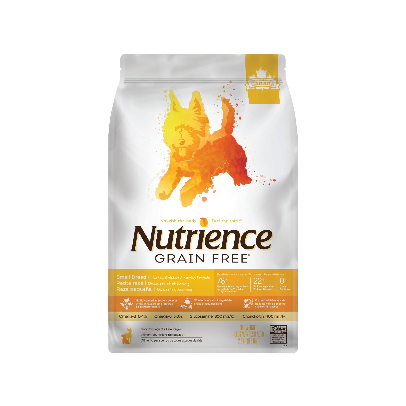 Our signature everyday dog food for all life stages, in a smaller kibble size for small and toy breed dogs, Nutrience Grain Free Turkey, Chicken & Herring Formula for small breed dogs especially suits active or grain-sensitive dogs. Made in Canada with fresh never frozen animal ingredients, Nutrience Grain Free closely mimics a carnivore’s ancestral diet.